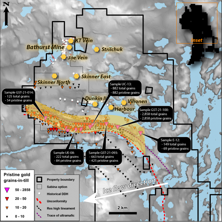 Several regional targets have recently been defined by Prosper Gold, most notably the Golden Corridor in the central portion of the Project. The Golden Corridor is characterized as a multi-parameter geophysical anomaly near a regional unconformity that serves as a major structural corridor. Based on till sampling results achieved late in the 2020 exploration season, the prospective geophysical and geological characteristics are underpinned by a 3,300 by 500 metre pristine gold grain-in-till anomaly with samples containing up to 882 pristine gold grains that is open for expansion.