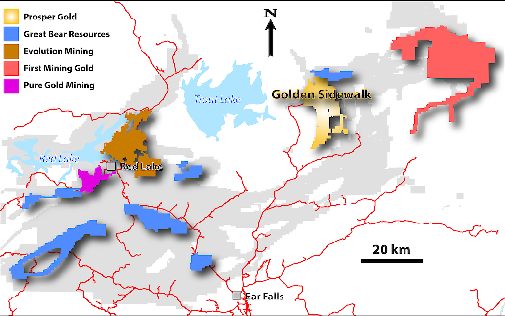 The Golden Sidewalk is a district-scale gold exploration project covering over 160 square kilometres of contiguous mineral claims and mining leases in the western Birch-Uchi Greenstone Belt, approximately 60 km east of Red Lake, Ontario. The vehicle-accessible project straddles 12 kilometres of the Balmer Assemblage – Narrow Lake Assemblage unconformity, a regional-scale feature that has been the Red Lake exploration guide, but which has seen limited exploration in the project area. The recently identified “Golden Corridor” lies immediately north of the unconformity in the western portion of the property and is characterized as a highly prospective, greater than 5 kilometre trend of coincident favourable magnetic and resistivity lineaments supported by highly anomalous gold-in-till samples covering 3.3 by 0.5 kilometres. Historical drilling programs at the Bathurst Mine, Joe Vein, KT vein, Dunkin and Vihonen prospects reported high-grade gold intercepts which warrant follow-up.