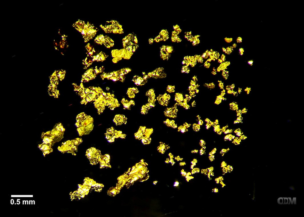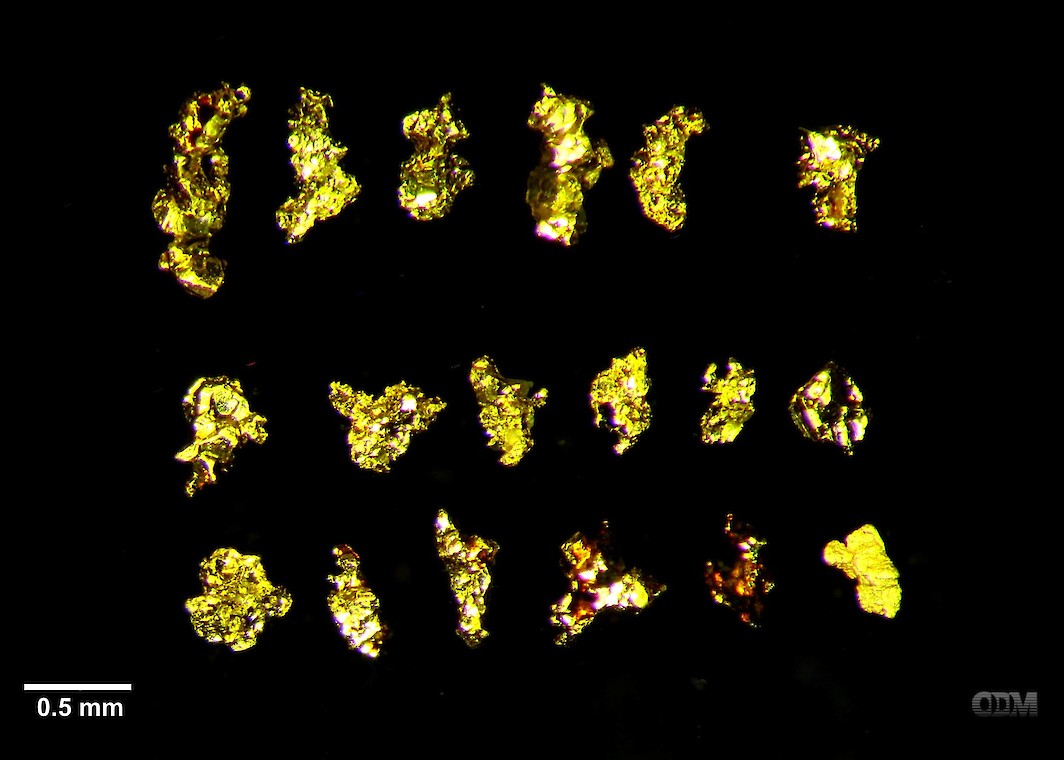 Photomicrograph of isolated gold grains from Golden Corridor Infill Till Samples. (Sample UC-13. Note scale bar in lower left.)